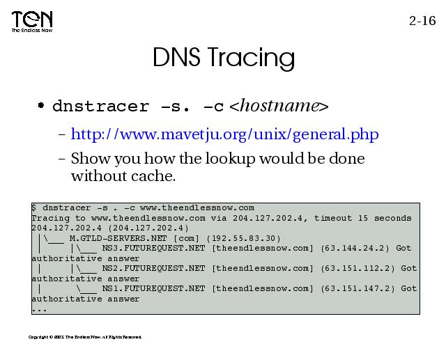 The -s . (dash s dot) tells dnstracer to start the query from the root servers. The -c option tells dnstracer to ignore cached data.
